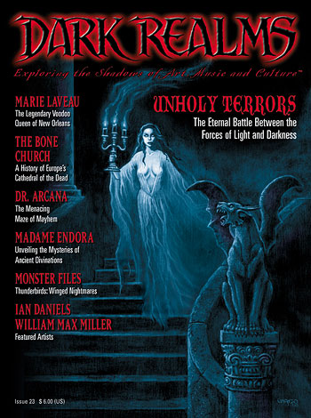 To everyone at Dark Realms: Just wanted to say "WOW!" I've received my first issue today (18) and I haven't been able to put it down. I'm like a kid in a candy store. I am thoroughly impressed with the professional quality of it all (the in depth research, the variety of the articles, the gorgeous artwork, and even the glossy paper!) Congratulations on creating such a ghoulishly delicious magazine for all of us who revel in the darkness and the occult. This is one magazine that will be read from cover to cover in our household!! Thank you!