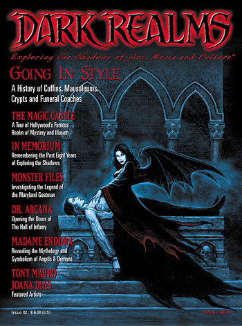 I received the latest issue yesterday, and spent last evening sorting through another fantastic compilation of things dark and wonderful. Ii did see in the back of the magazine where you are going to discontinue Dark Realms with the Halloween issue. I hate to see the publication stop, but i completely understand and wish only the very best for you in all of your current, and future, endeavors. Ii have all of the issues, save the very first one... that I still cannot seem to find. They'll certainly remain a treasured part of my personal library.